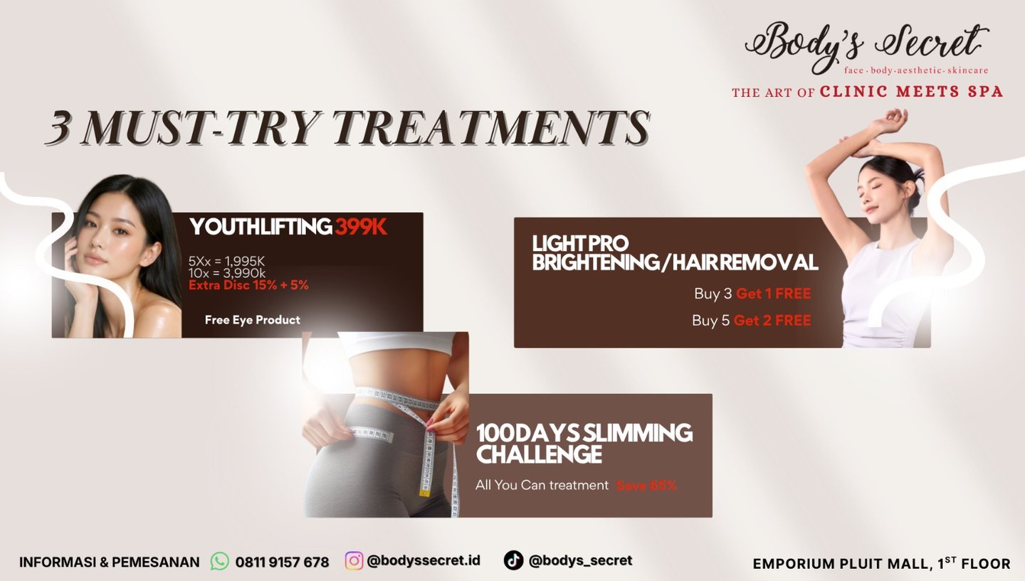 Segera kunjungi Body's Secret dan rasakan perbedaan hasil treatment yang dirancang secara khusus untuk memenuhi kebutuhan anda
